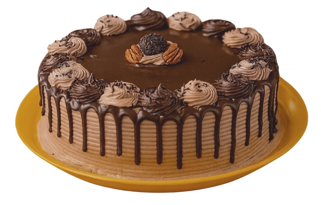 Pan de chocolate bañado en tres leches relleno de crema pastelera y nuez decorado con crema batida sabor chocolate y con hilos de ganache de chocolate.